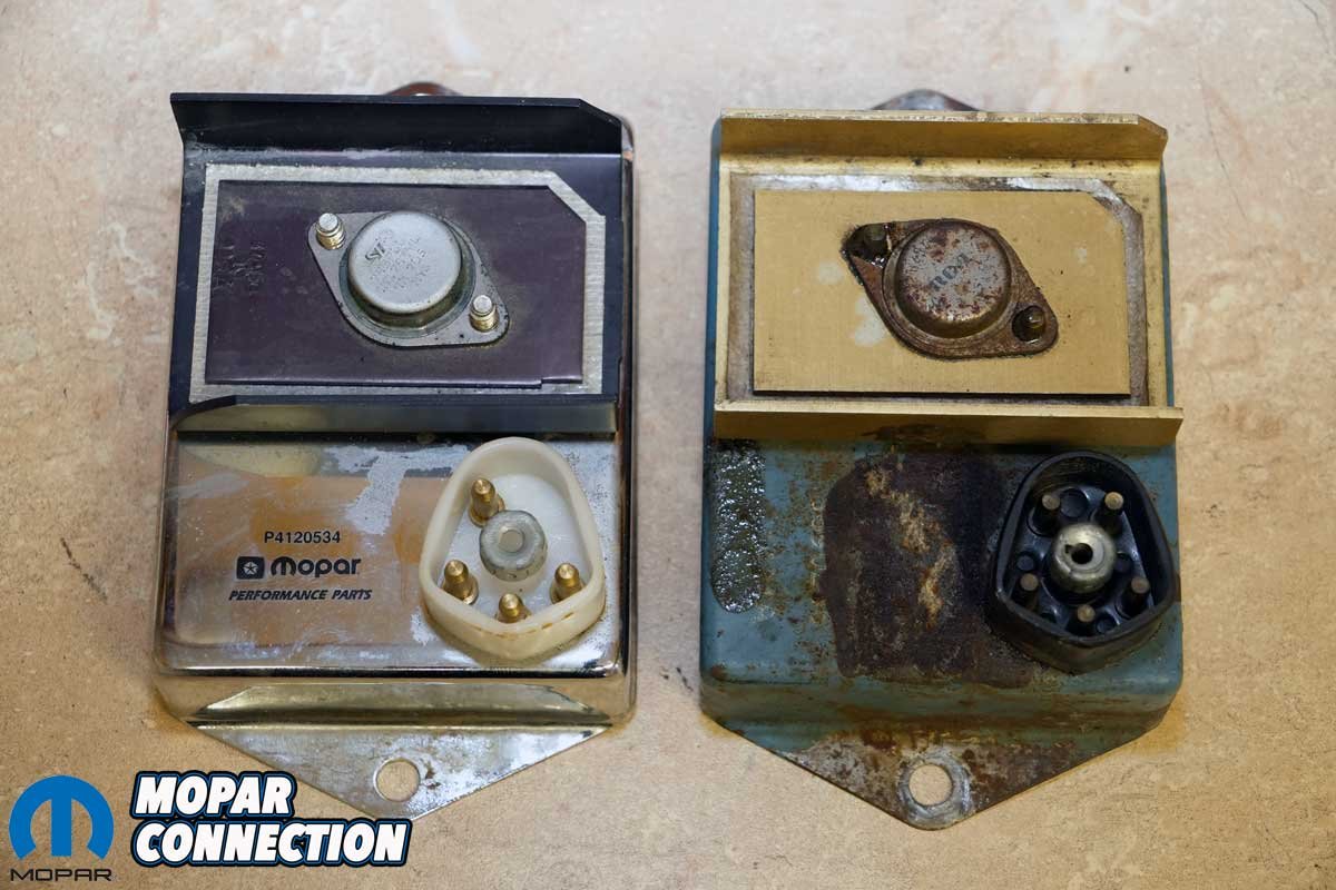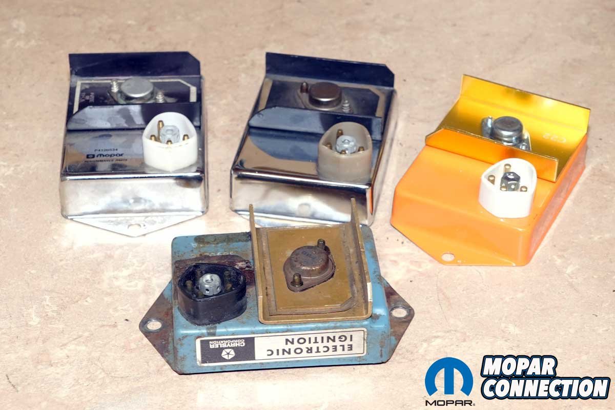 Above Left: Chrysler ignition modules have remained relatively unchanged in appearance since its introduction. The unit in the foreground is an original 1970s module, while the back row consists of a pair of Mopar Performance “Chrome boxes” and an “Orange box.” Above Right: The late-model (left) ignition modules use a 4-pin module and a single ballast resistor. The original units (right) had a 5-pin design and a dual ballast resistor.