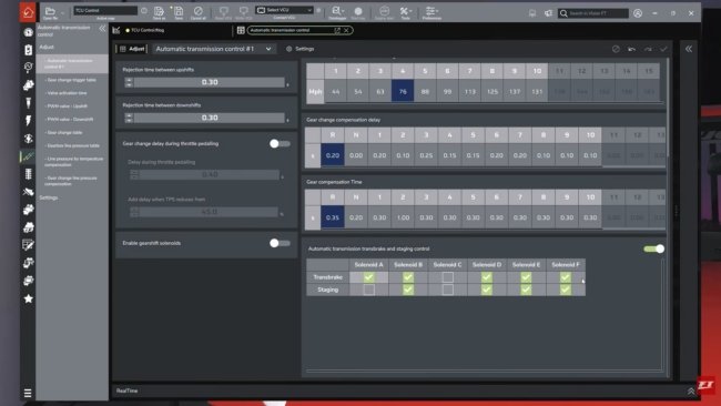Settings include minimum and maximum RPMs and speeds for each gear, valve activation times, and pulse width modulation (PWM) for upshifts and downshifts. There are even tables to enable the transbrake and staging functions.