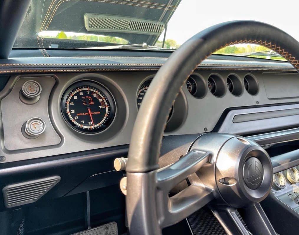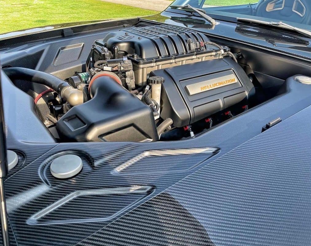 Powering the Hellucination is a 1000 horsepower 7.0L Hellephant crate motor with a ZF 8-speed transmission behind it. In an attempt to hold as much of the 1000 horsepower to the ground are 19×9 front wheels wrapped with 245/35ZR19 tires and 20×12 rear wheels wrapped with 345/30 ZR20. Big Brembo brakes at all four corners helps bring this beast to a stop.