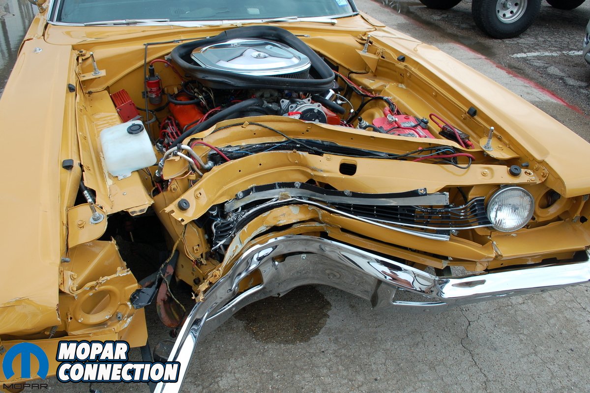 The inner fender and radiator support are heavily damaged as well as basically everything sheet metal and trim wise from the cowl forward. The windshield has not cracked but there is damage to the cowl and firewall we’ve been told. The doors were also pushed back into the quarters by the fenders. This one is not for the faint of heart and will definitely need extensive repairs and time on the frame machine to get it straight again. Thankfully, the guys at Classic Muscle Metal have all of the needed parts!