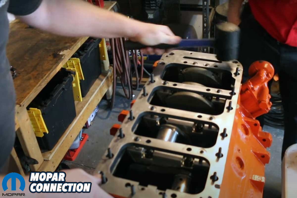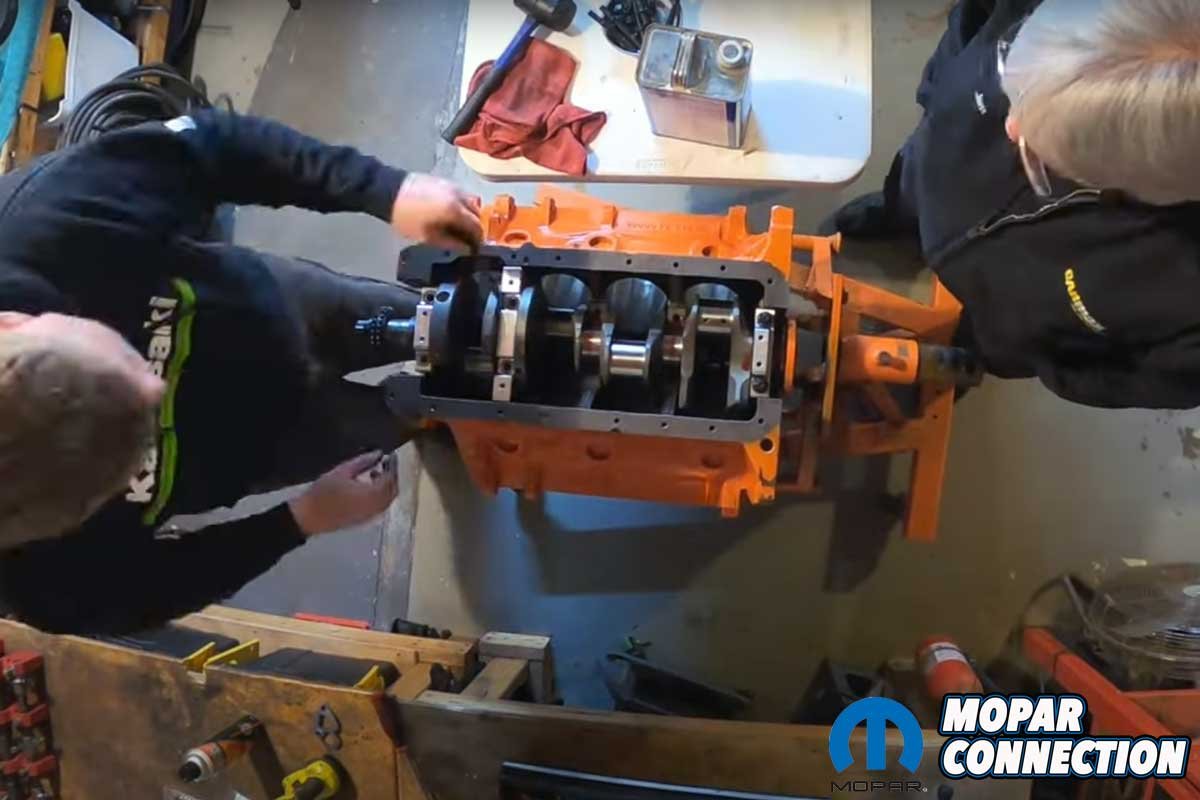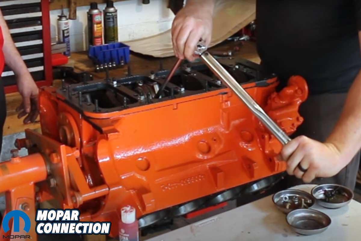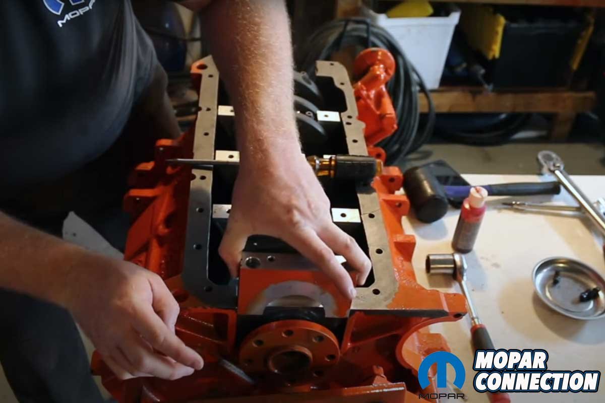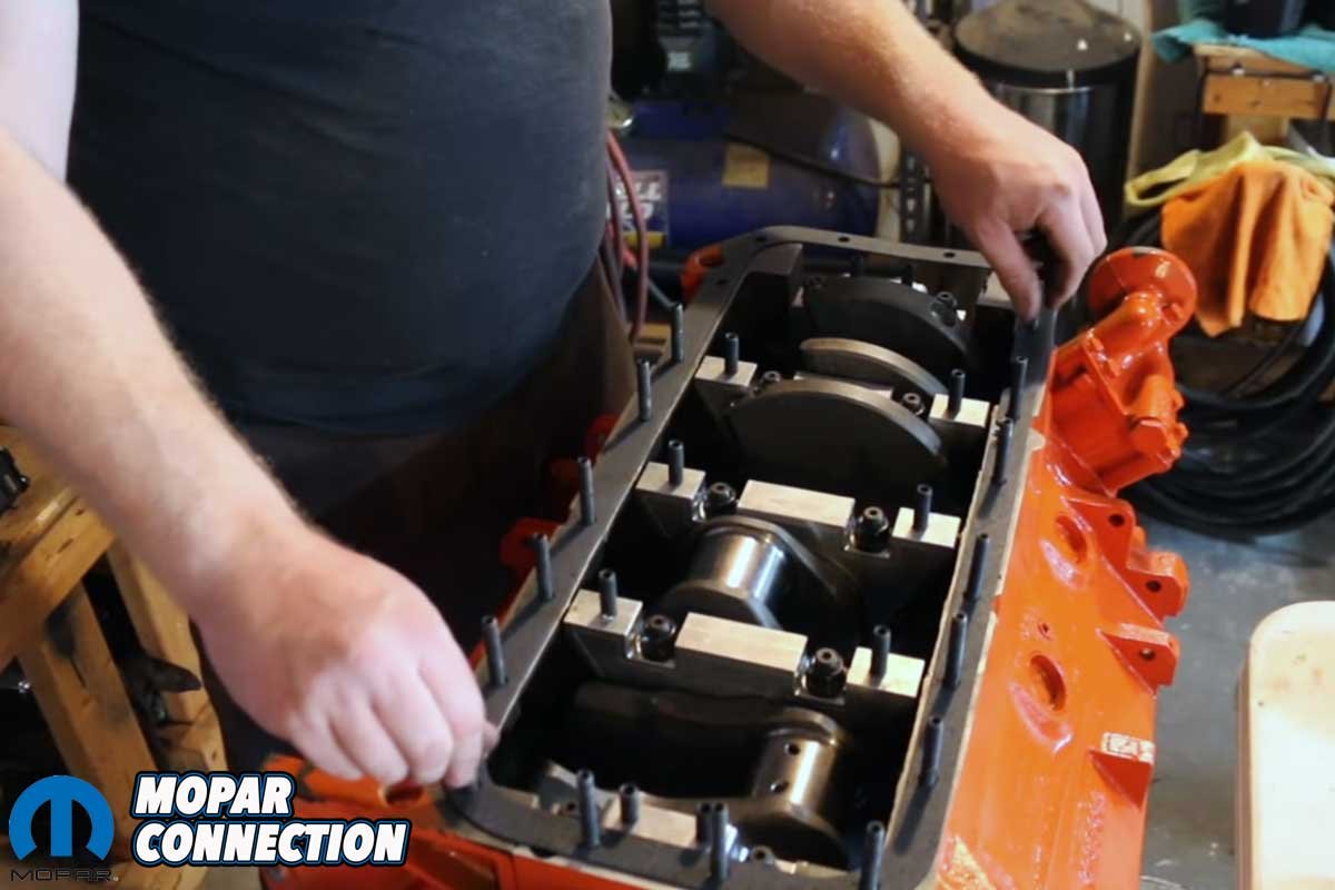 When the block returned from the machine shop, the reassembly started (again). Although the camshaft was already in the block, we pulled it out slightly to lubricate the journals. Once lubricated, we reinstalled the camshaft. We placed our K1 Technologies 4.250-inch stroke crankshaft (8-bolt Hemi flange) on the block’s mains. A set of Clevite bearings supported the crankshaft, and the SD Concepts billet main caps secured everything in place.