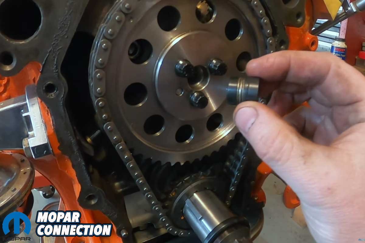Above Left: A COMP Cams double roller timing chain was placed between the crank and the cam. Above Right: Once secured, we added a cam button to eliminate the camshaft’s forward and rearward movement.