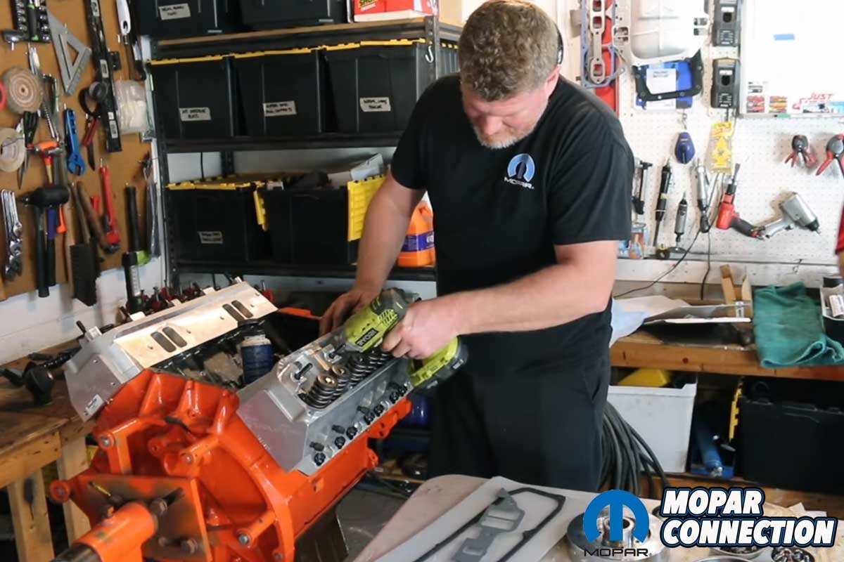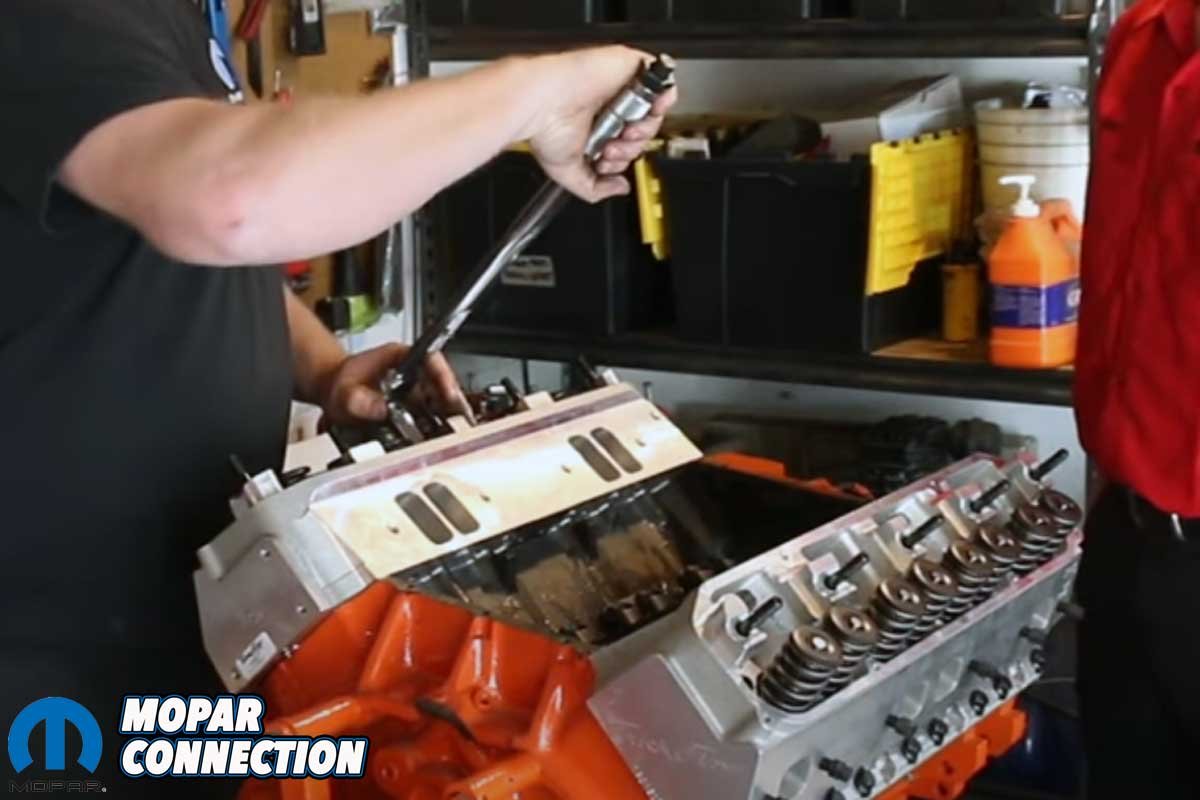 Above Left: With the heads on their respective decks, we snugged the head bolts with an electric impact gun. Above Right: Using a torque wrench and following the factory bolt torque sequence, we torqued the head bolts in three stages of torque as provided by Trick Flow.
