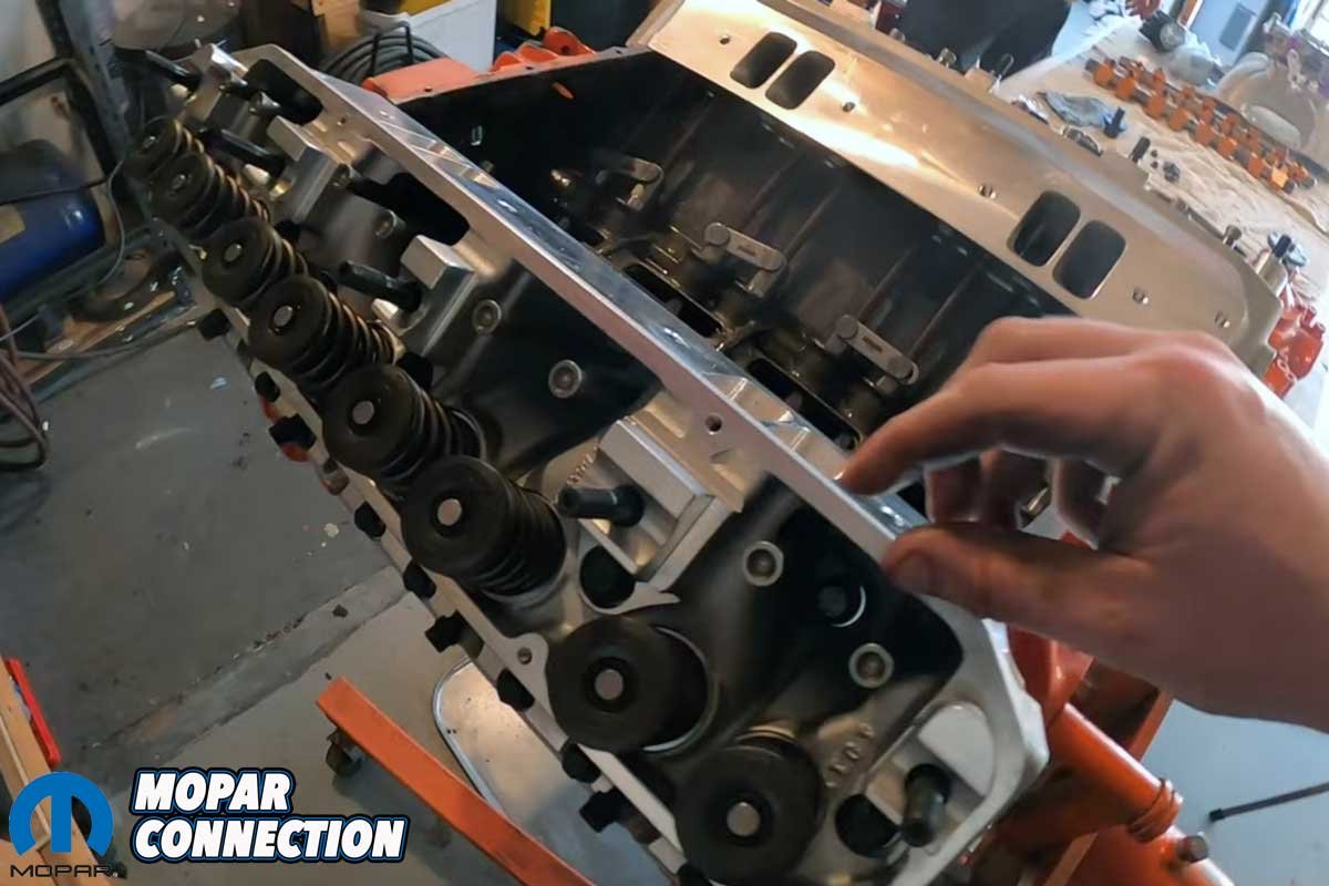 We placed head gaskets on the block decks and installed the heads. Following the factory torque sequence, we torqued the head bolts in three stages to ensure the heads were adequately secured. The COMP Cams push rods dropped through the guides in the heads and lined up with the roller lifters. We installed the Harland Sharp roller rockers, shafts, and fasteners. Once the shafts were mounted, we lashed the valves.