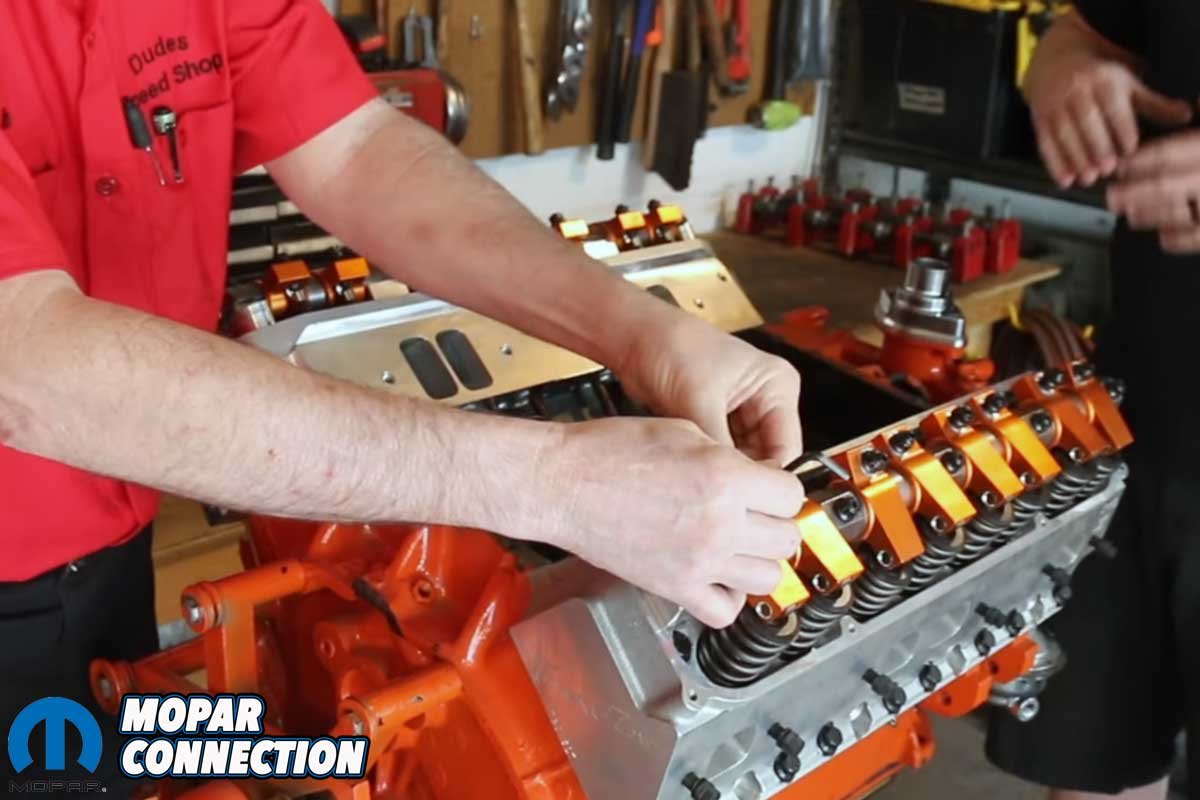 Top Left: We slipped a set of COMP Cams pushrods through the Trick Flow heads and into the Howard Cams roller lifters. Top Right: The Howard Cams roller lifters fit perfectly into the 440 block. Bottom Left: The COMP Cams pushrods are cupped on the upper end to engage with the adjustable rocker arms. We had already installed the rocker shaft studs. Bottom Right: We finessed the Harland Sharp rockers and shafts over the valves and the mounting pedestals.