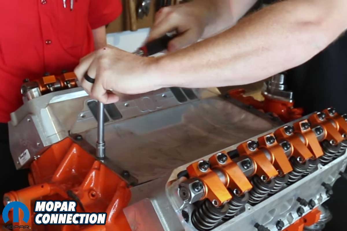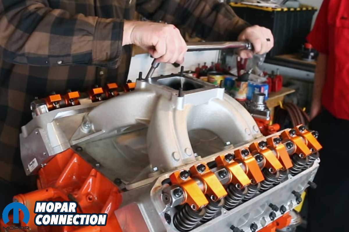 Top Left: Although it would need final adjustments when we did our dyno testing, we did an initial setup of the valve lash. Top Right: With the lash adjustments completed, we contemplated the horsepower number the engine would achieve. To our benefit, our educated guesses were surpassed. Bottom Left: We secured the Mancini Racing valley pan and end rails. Bottom Right: We dropped on a Trick Flow Track Heat square-bore 4150 manifold onto the 505.