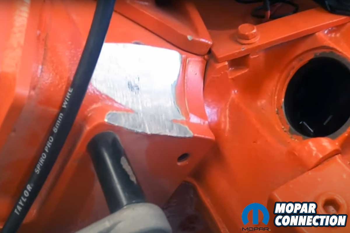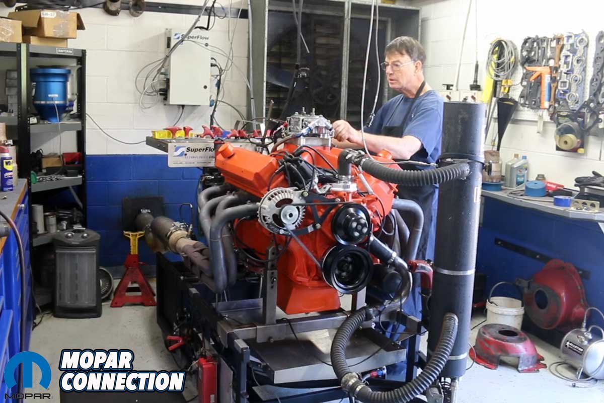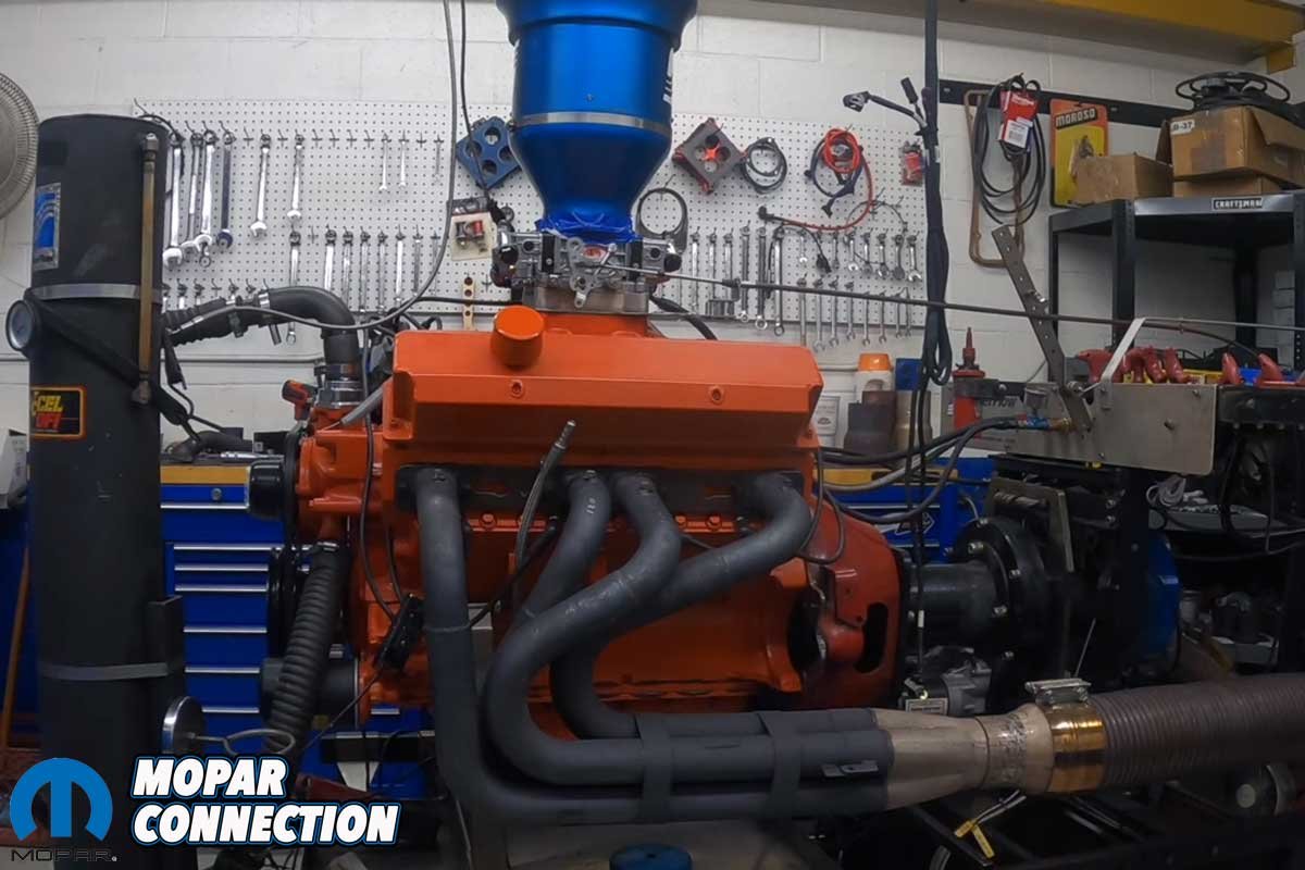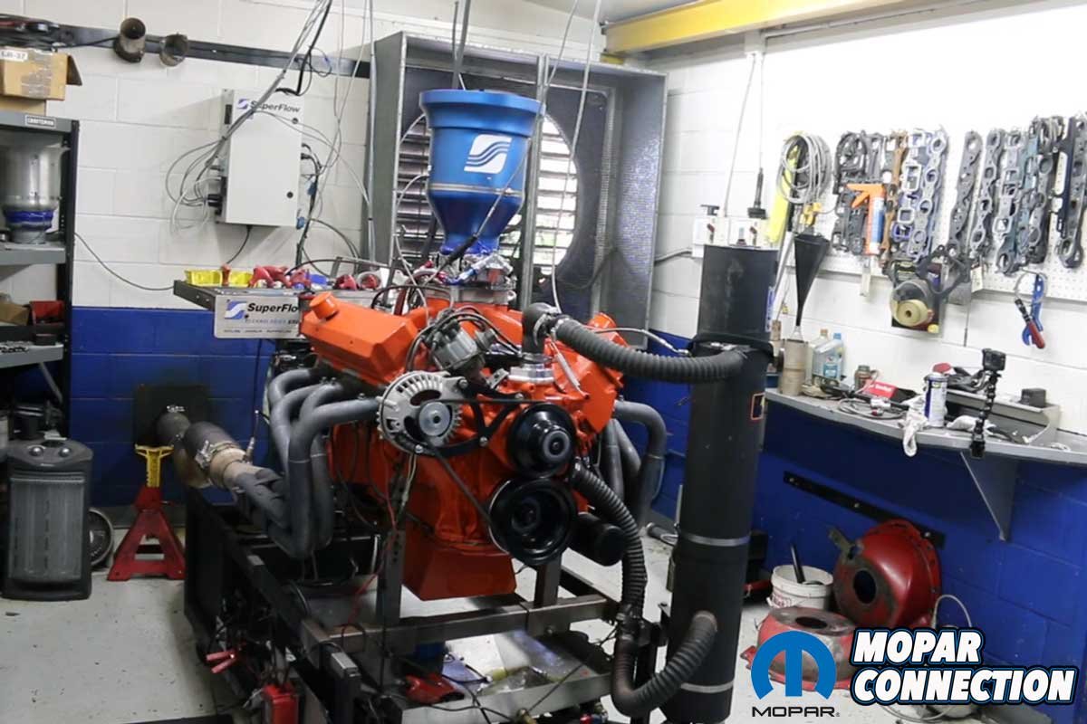 Top Left: The 505 was complete, minus the pulleys and alternator brackets. The beautiful Trick Flow valve covers did not include provisions for the oil fill hole or the PCV system. Top Right: The 505 was in full dress with the heads painted and a pair of hand-welded valve covers. We added 440 Source pulleys to the engine. Bottom Left: As is often the case with aftermarket heads and aftermarket distributors, they both require the same real estate, so we massaged the head for clearance. We would repaint the head later. Bottom Right: After completing the break-in period, we made some wide-open-throttle pulls on the 505. We ran it up to 5800 rpm for all six dyno runs.