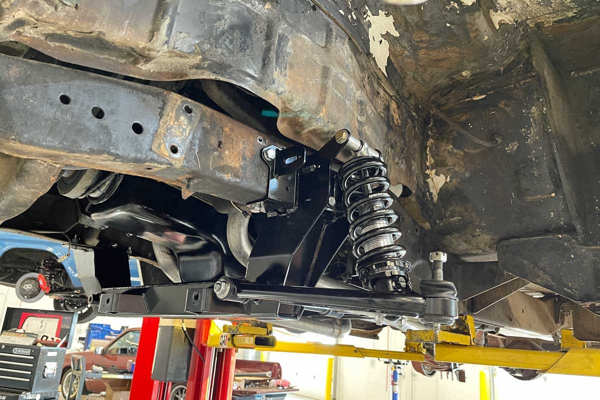 Above Left: The cross member bolted to each frame rail with seven fasteners. QA1 offers two different coil-over-shock designs, a single- or a dual-adjustable. Above Right: The IFS and the suspension components have been installed. The steering shaft to the rack and pinion has yet to be cut and installed.