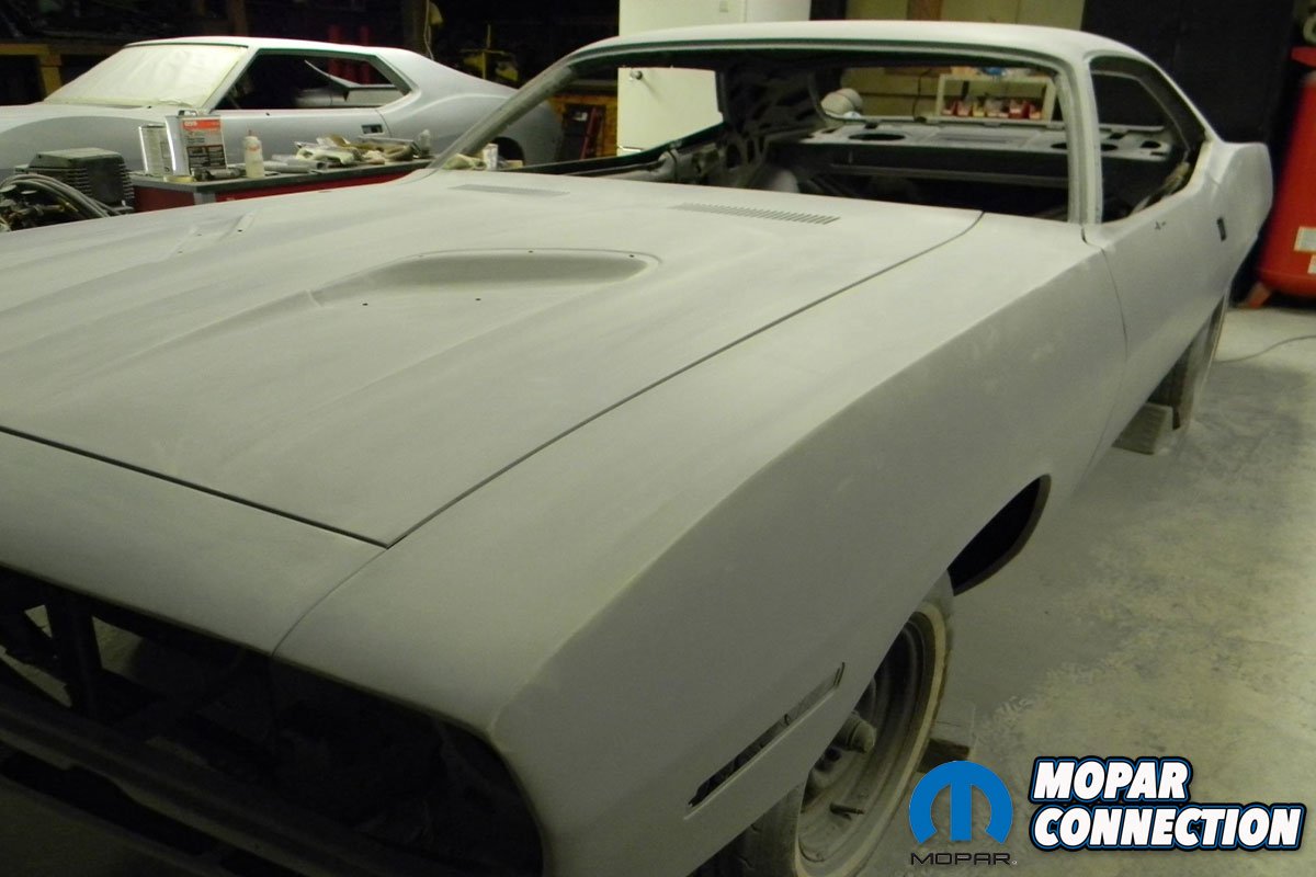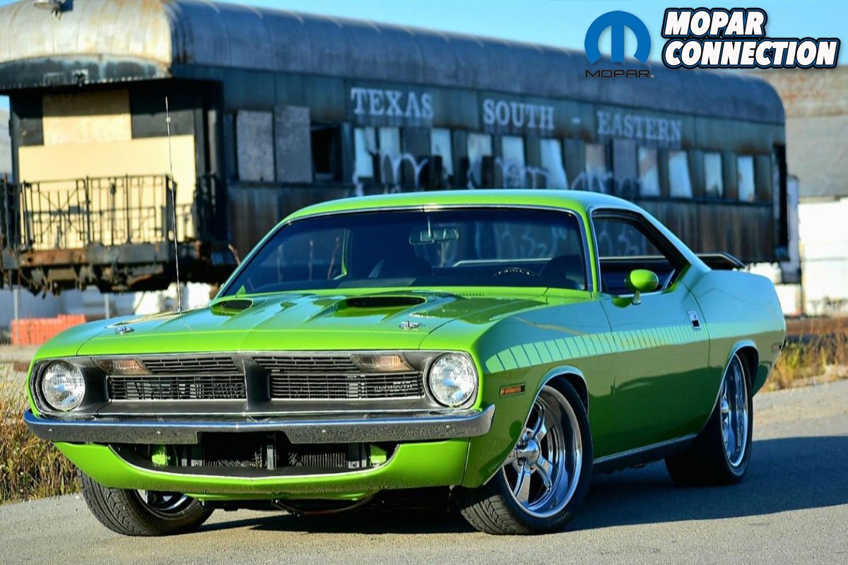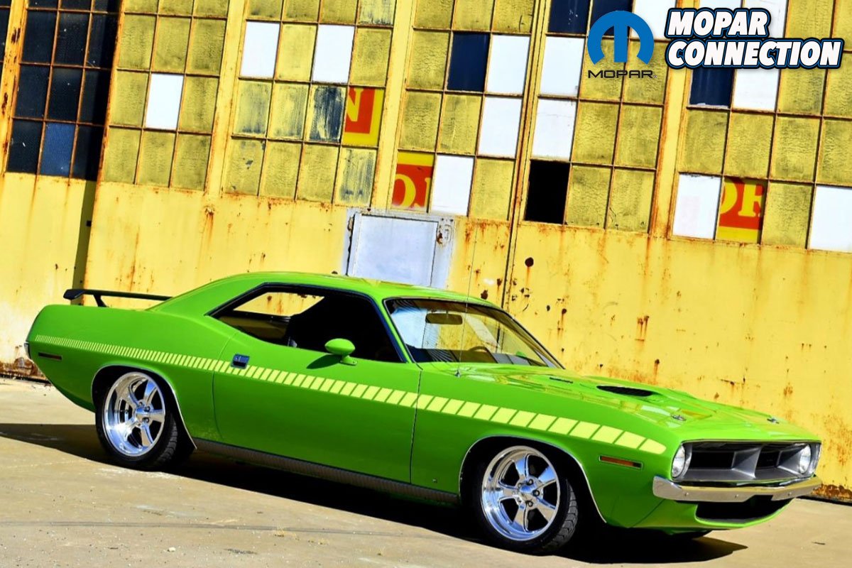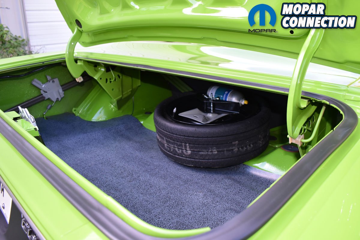 “With the drivetrain installed, it was now time to order all of the interior pieces I needed. While placing the parts order, and making sure I was ordering all the correct parts, a Barrett Jackson auction was playing in the background on the TV. Two 1970 ‘Cudas rolled across the auction block that caught my eye and would lead me to making a big change in my build. One ‘Cuda was FJ6 Sassy Grass Green and the other was FM3 Moulin Rouge and both had the rare matching mid body-colored strobe stripes. I instantly knew I had to have that for my car and quickly ordered the “Chartreuse Radiant” fluorescent strobe stripe kit from Phoenix Graphics”, shares Sharma.