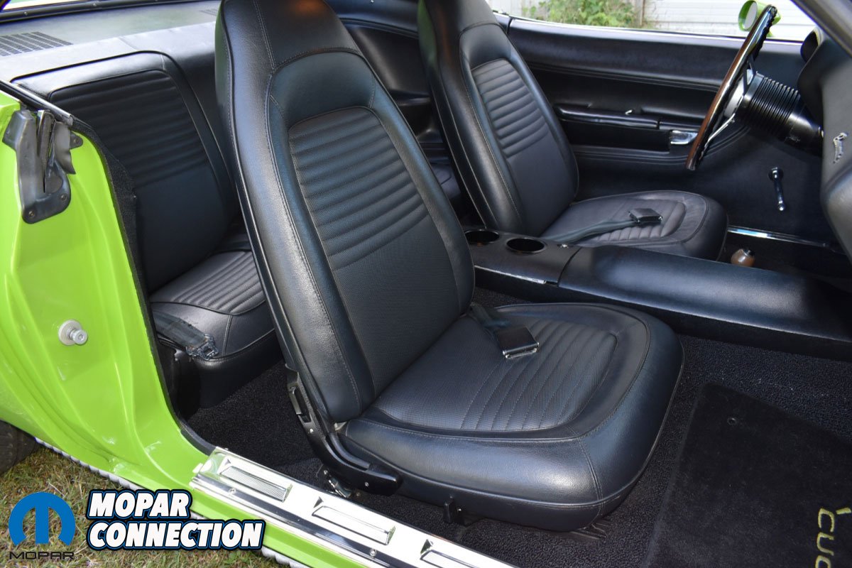 Once she received her parts order, the interior started to come together as she worked hard rebuilding the original seats by duplicating the original canvas, prepping and painting the frame and springs and getting the Legendary seat covers fitted right. When she finished up the seats, they were installed along with the rest of the new interior. New wiring was also installed through-out the entire car. Underneath, the steering and suspension was upgraded with Firm Feel parts and it was lowered 1.5 inches to make the ‘Cuda handle like a new car.