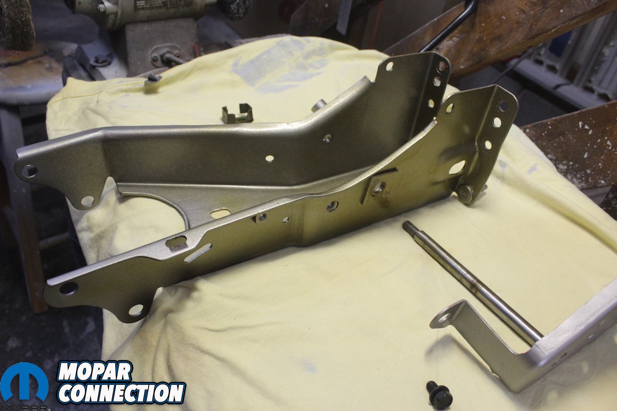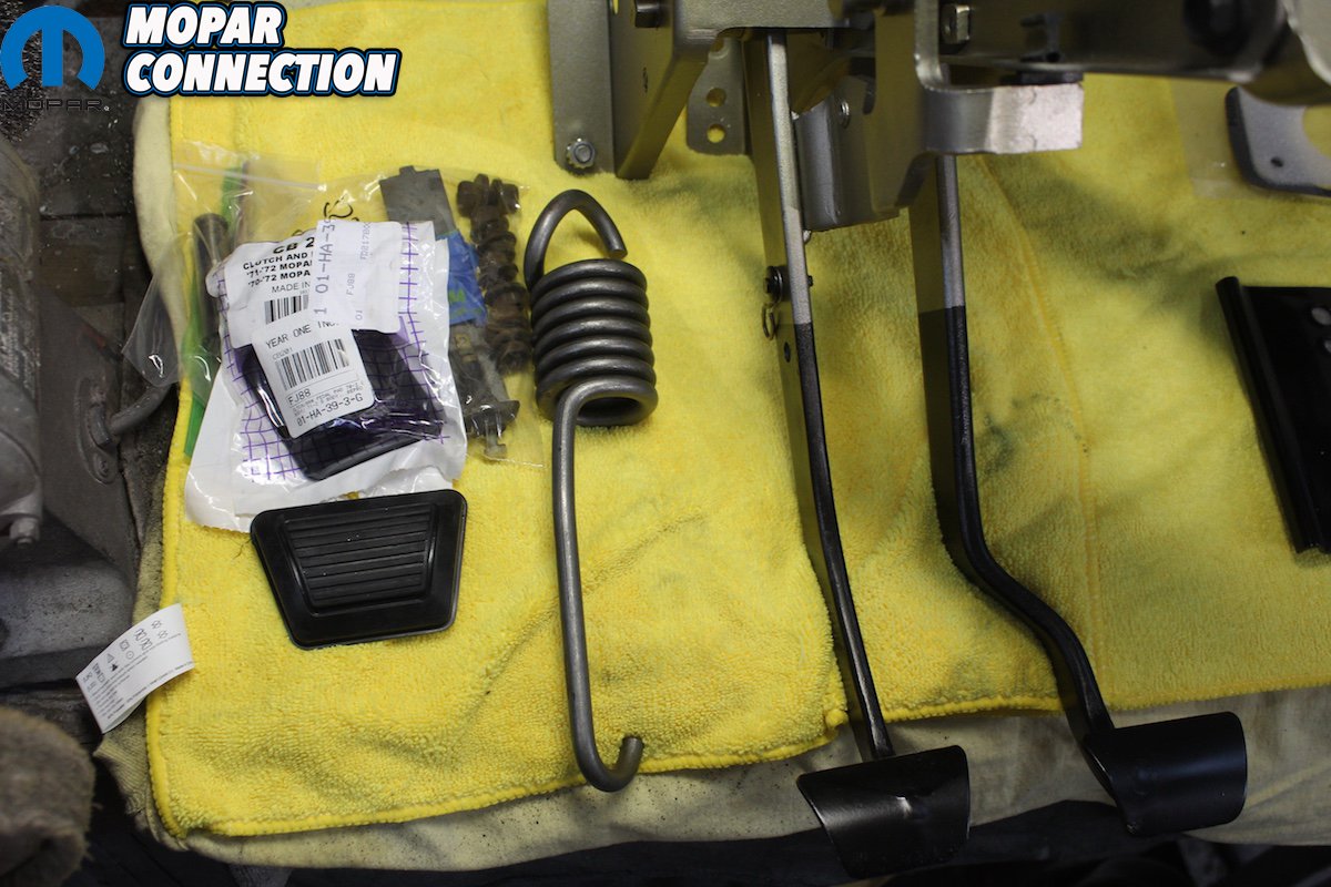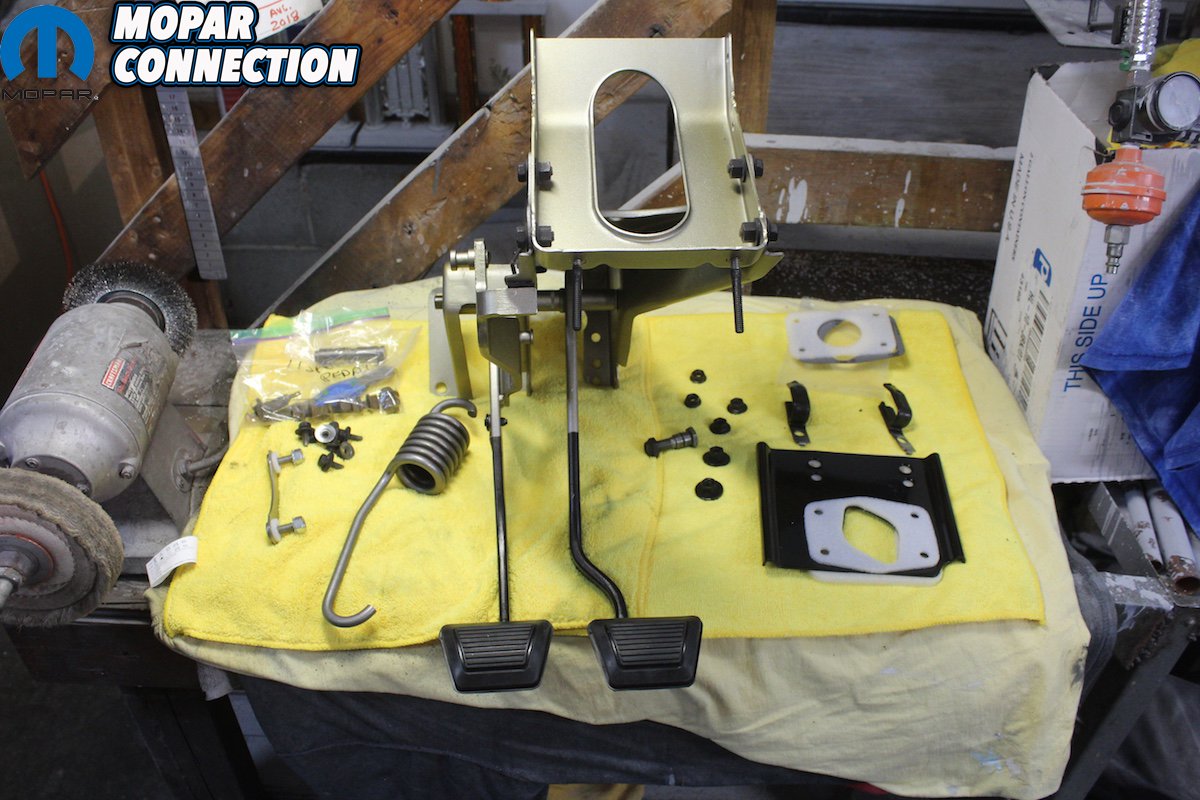 Above left: Since we already had painted all the parts, black phosphate plated the bolts and nuts, and had all the needed new parts on hand, the assembly came together pretty easy. Notice the plastic “speedometer” clip and the rubber “clutch bumper” installed. Above center: Now that the basic 4 speed pedal assembly is done we can move on to the installation. When we bought the 4-speed pedal assembly we made sure it was for a 1970 E-body. Notice the clutch safety switch wire loop on the clutch pedal. It is not there on other years. We also got new pedal pads and clutch spring from YearOne. Above right: Here we have laid out all of the parts and seals needed to install the pedals and master cylinder in the “Comeback Cuda.” The Master cylinder backing plate is gloss black. The foam seals are white and the wiring brackets are natural with the ends dipped in a black rubber coating. The 4-speed bracket has been finished in the “Cosmoline” process. The clutch return spring is natural steel.
