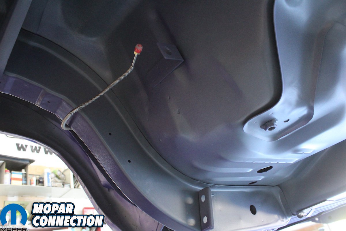 Above left: Just like that everything is installed and tightened. The Master cylinder cover is gold cadmium plated, the hold down bracket is natural, and the “H” head bolt is black phosphate. Since all of the metal is brand new we needed to get the correct place for the holes and brackets to run the rear brake lines. Above center: Using the brake line clip set from YearOne we followed the AAR’s placement of the clips, bolts, and clamps. This first clip is black phosphate plated and fits the coil wrapped line perfectly. Above right: Using exact measurements from the AAR ‘Cuda, we drill two holes in each floor support. The clip location and the bolt with clamp location are based on what we found on the AAR ‘Cuda. Since there are two holes in each bracket different cars will probably have different combinations and locations of these clips. The line is fed through the torsion bar support.