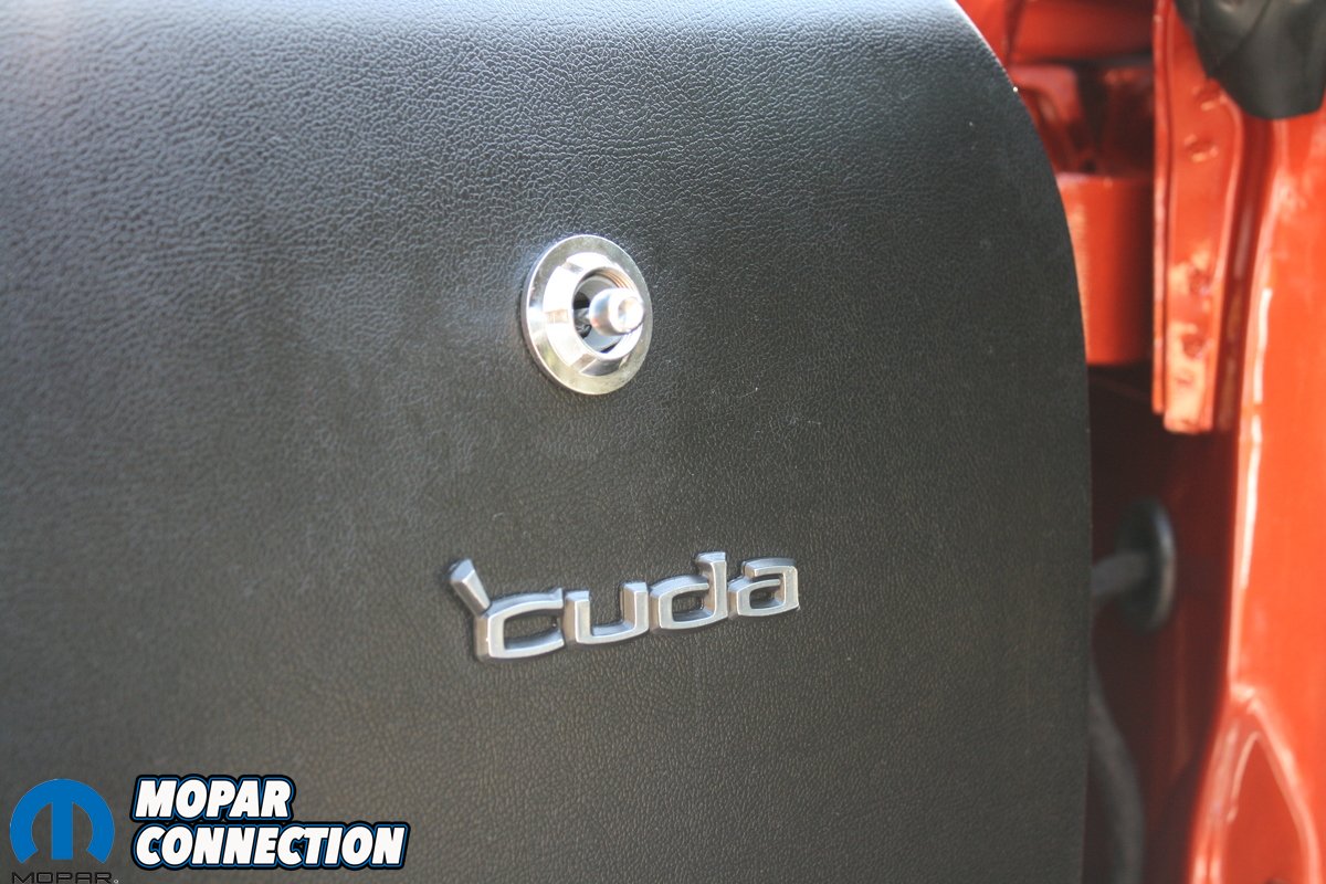 As it turns out, the ‘Cuda was an original 340 4-speed car painted in FK5 Burnt Orange and stuffed with black interior. For options, it came with the 3.91 axle package, Rallye dash, painted mirrors, console and a few others. Over the years, it got repainted a few times and eventually was sprayed in the ugly school bus yellow color Barnabas found it in. The original 340 was long gone and a 360 with a tunnel ram was in its place. Like most Mopars, the ‘Cuda was full of the typical 70’s modifications like Cragar mags, a fiberglass scooped hood, huge spoiler and a bunch of decals for good measure. Once Barnabas got the car back to his shop, the first thing he did was pull the back seat where he hit the jack pot by finding the original broadcast sheet. The car also retains its original fender tag in fantastic shape.