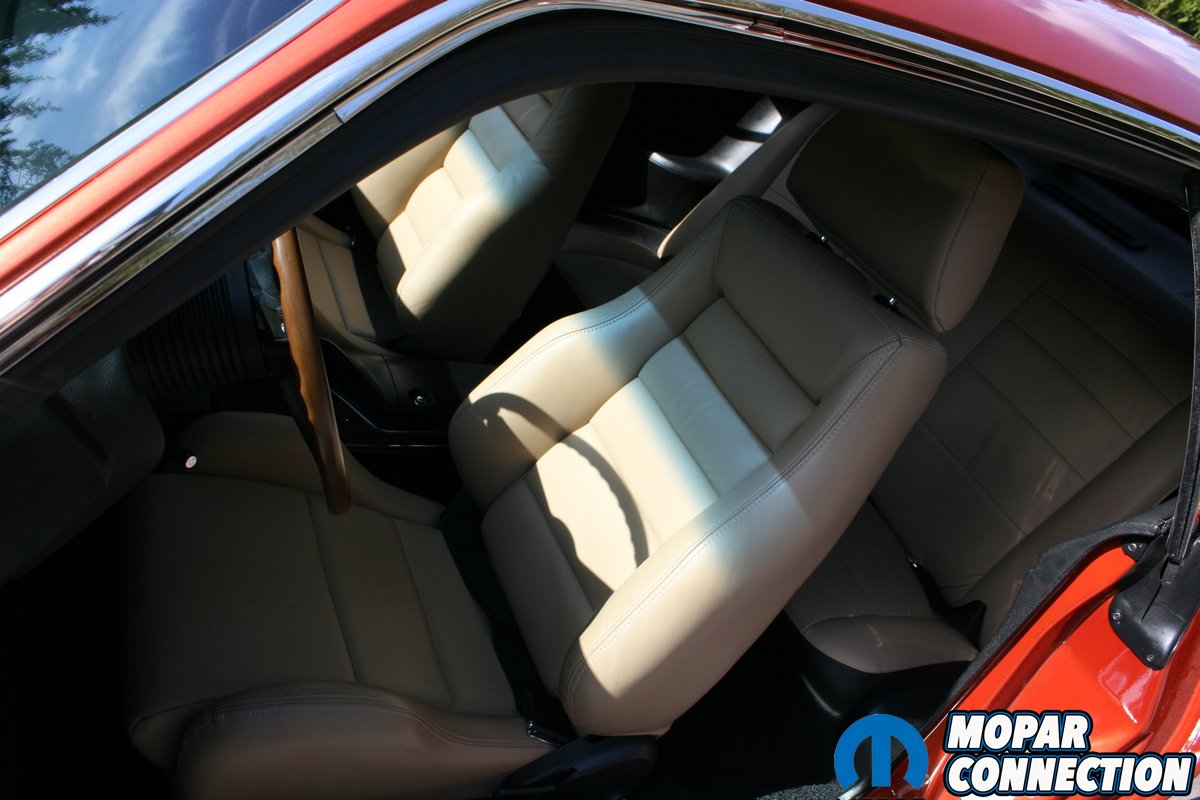 The last item to finish was the interior. A nice original dash pad was one of hardest parts to find, as Barnabas says the reproductions available at the time were not very good quality. After years of searching, he managed to source one on-line from a member on Moparts.com. A reproduction headliner and carpet were installed and the original door panels and console were cleaned and re-installed. Instead of using the original E-body front seats, Barnabas decided to use Corbeau seats that were custom ordered in tan leather to keep him in place better while cruising around. Additional matching leather was ordered for the rear seat and it was re-upholstered in the matching pattern by 360 Fabrications in Abbotsford, BC.