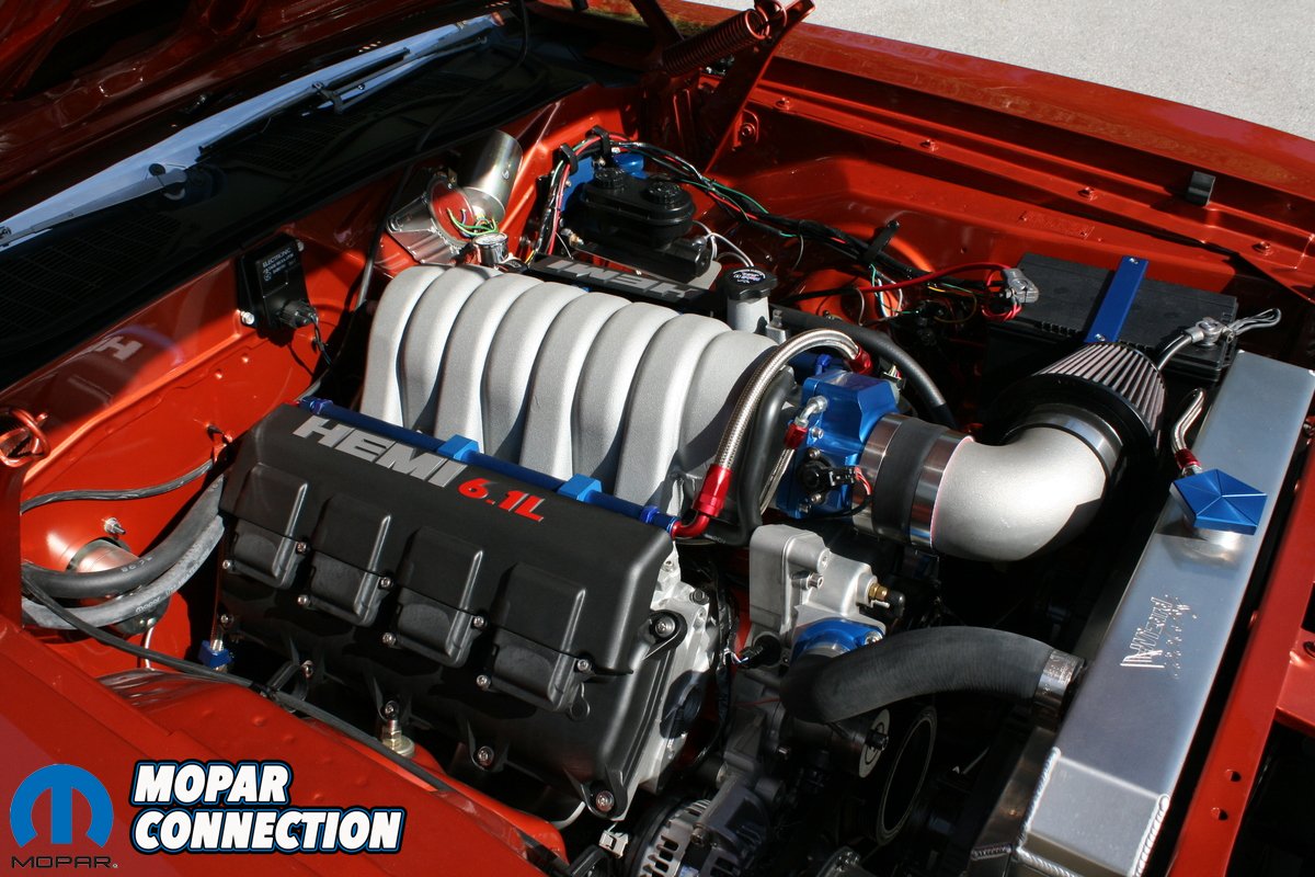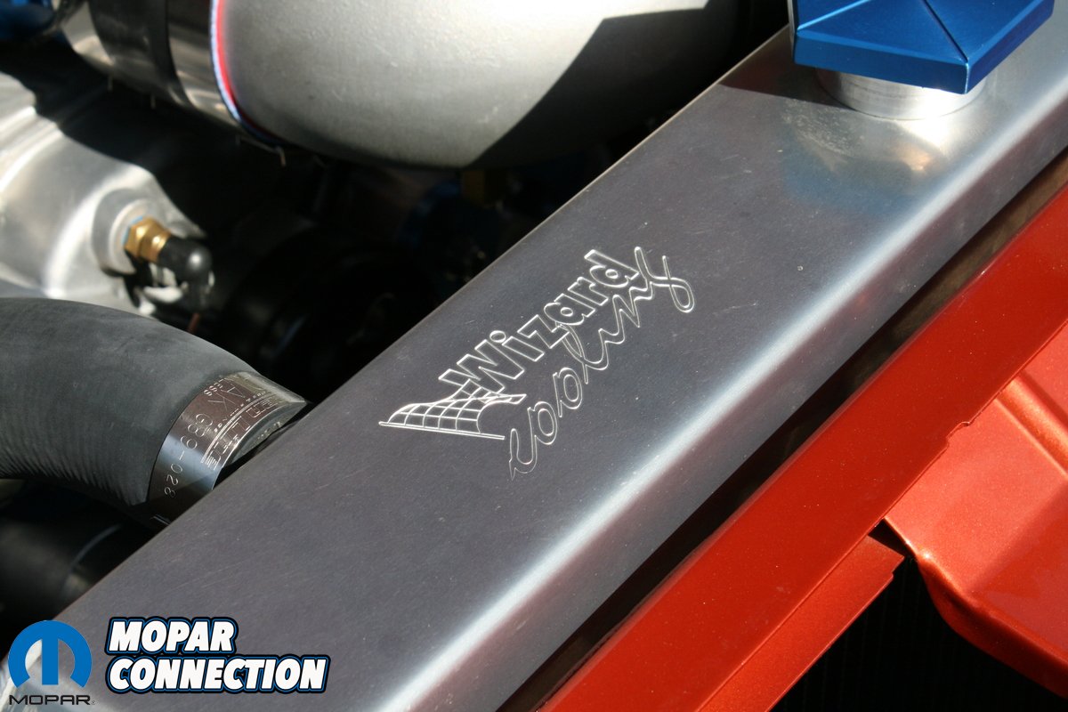 For the transmission components, Barnabas turned to then operating Keisler Engineering for a Tremec TKO-600 5-speed, billet flywheel and a ceramic faced clutch which is hydraulically actuated. The stock 8 3/4 rear end was rebuilt with a new 3.91 ring and pinion, all ARP fasteners, solid pinion spacer, an early clutch type Sure-Grip and custom made axles. Rather than find a wrecked SRT8, the engine is a brand new Mopar replacement 6.1L Hemi that was bought from Chrysler and came complete with the intake, fuel injectors, throttle body, wiring harness and other goodies. It was very quick that Barnabas decided to upgrade the engine as the stock 425 HP was not going to cut it. The first thing he did after taking it out of the crate was to disassemble it down to the short block. The heads were sent off for a complete CNC port job and upgraded valve springs. The intake flow on the ported heads is 350 CFM at 0.600” lift. A custom ground camshaft was supplied by Modern Muscle, with 0.607” lift and 300 deg. Duration. The intake manifold was also ported, using CNC porting on the runners and further hand porting on the plenum. The fuel injectors were upgraded to 46 lb/hr units and the throttle body was upgraded to a 92 mm unit.