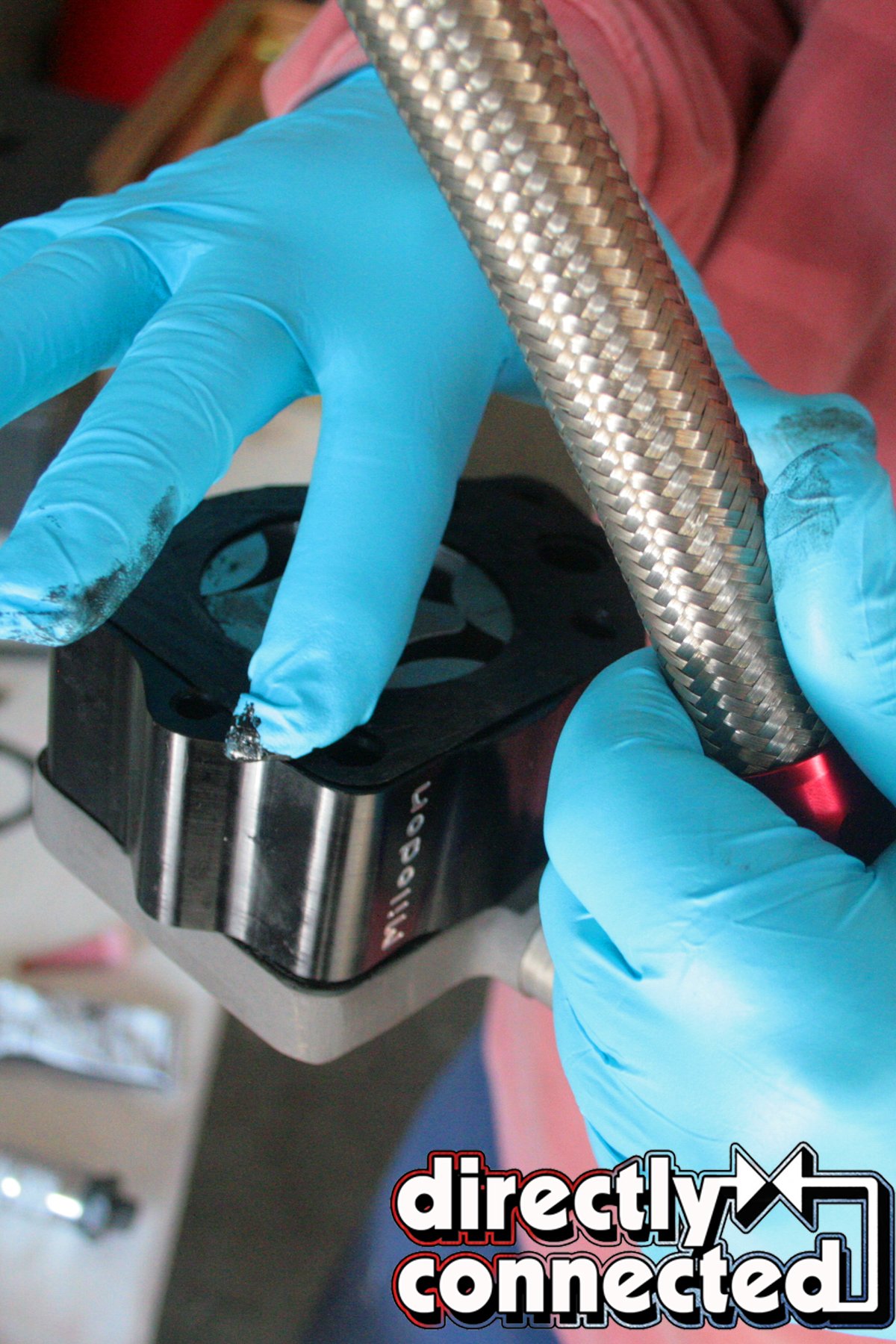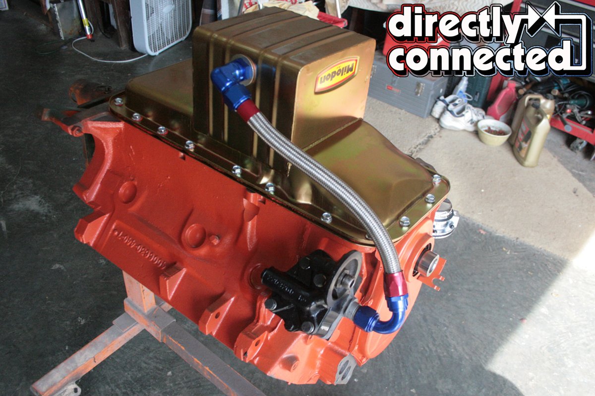 Above left: Before installing the Milodon external pickup pump, we apply a thin layer of RTV to both sides of the gasket, as well as to both sides of the pump itself (shown above center). Above right: The AN fitting feeding the external pump from the deep sump pan.