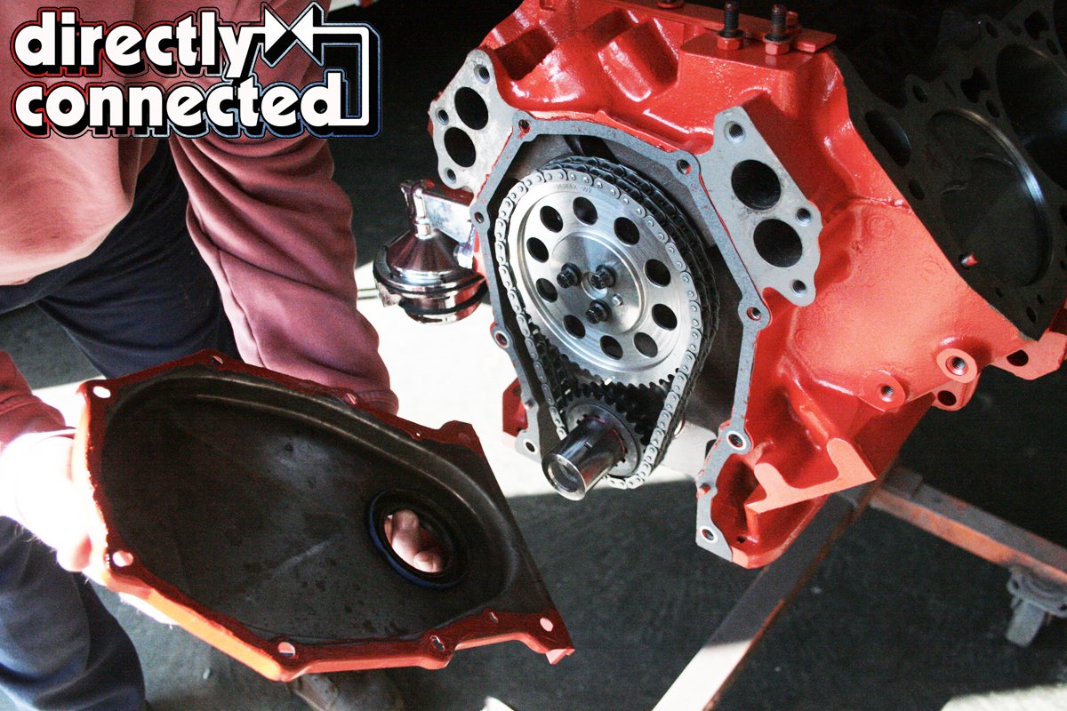Above left: With the timing cover off, we torque the three cam timing gear bolts down to the required specs before reinstalling the timing cover (shown above right).