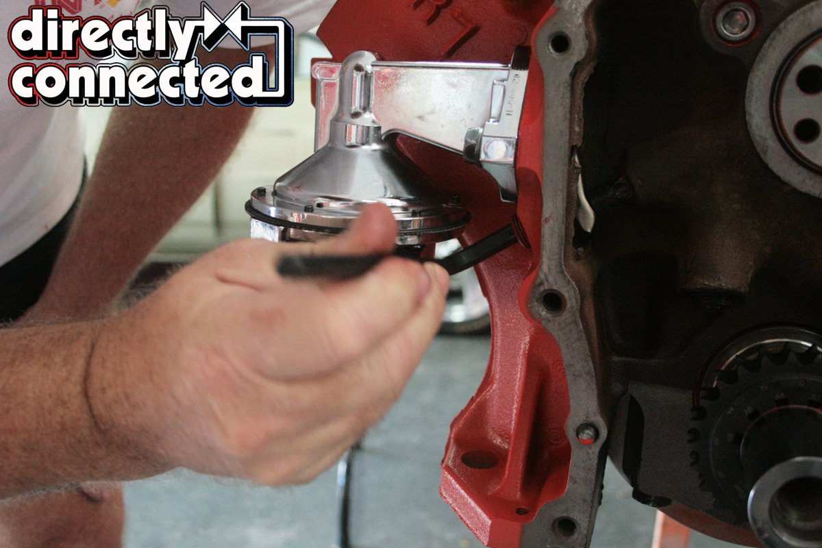Above left: With the rod well lubed, insert through the threaded port. Above center: Holding the rod in place, attach the mechanical fuel pump careful to make sure the rod rests on top of the pump’s arm. Above right: With everything in place, we tightened all the bolts down.
