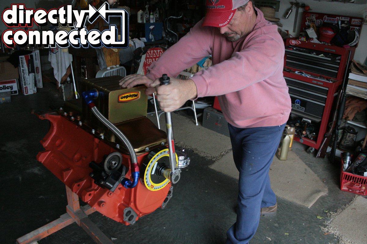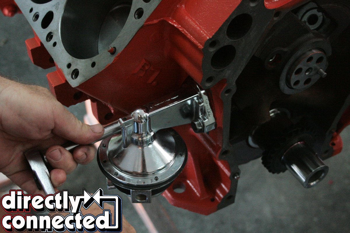 Finishing up our bottom end build, we lubed up and inserted the mechanical fuel pump cam, careful not to let it slide too far down before installing the 110 GPH Holley high performance fuel pump. With some moly for the bolts, the mechanical pump was tightened down. With that final step complete, we took a minute to sit back and admire our work. Of course, our engine is only half way done, but it sure looked good. Make sure to hang tight for a couple weeks for the exciting conclusion of our Wicked Wedge of The South and see how she ran on the dyno!