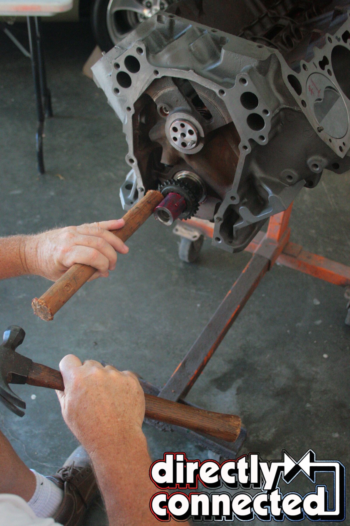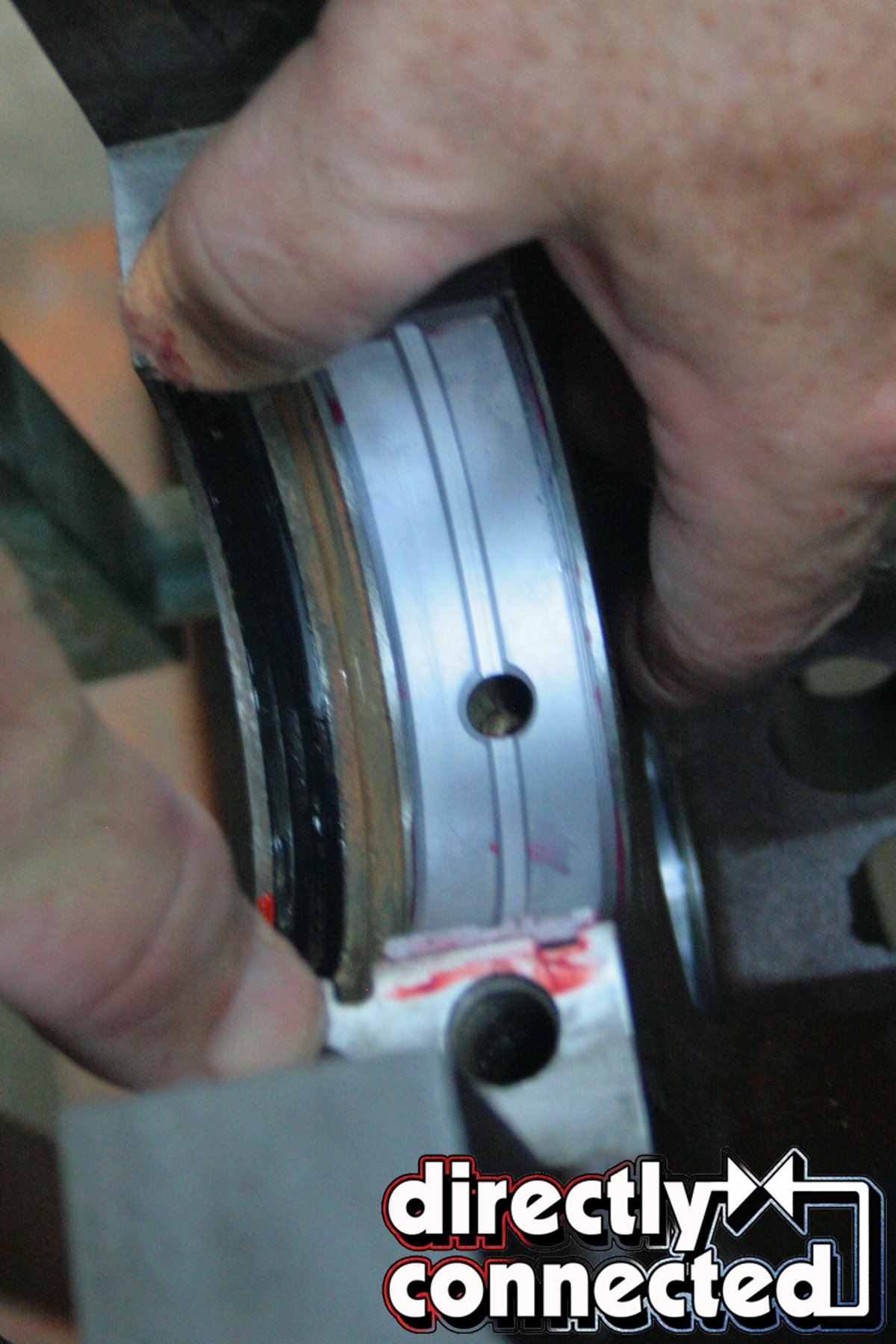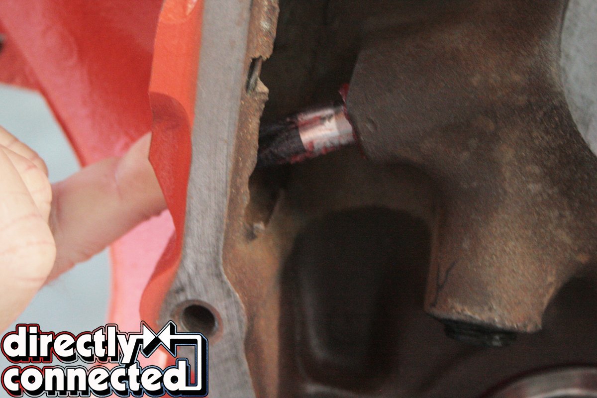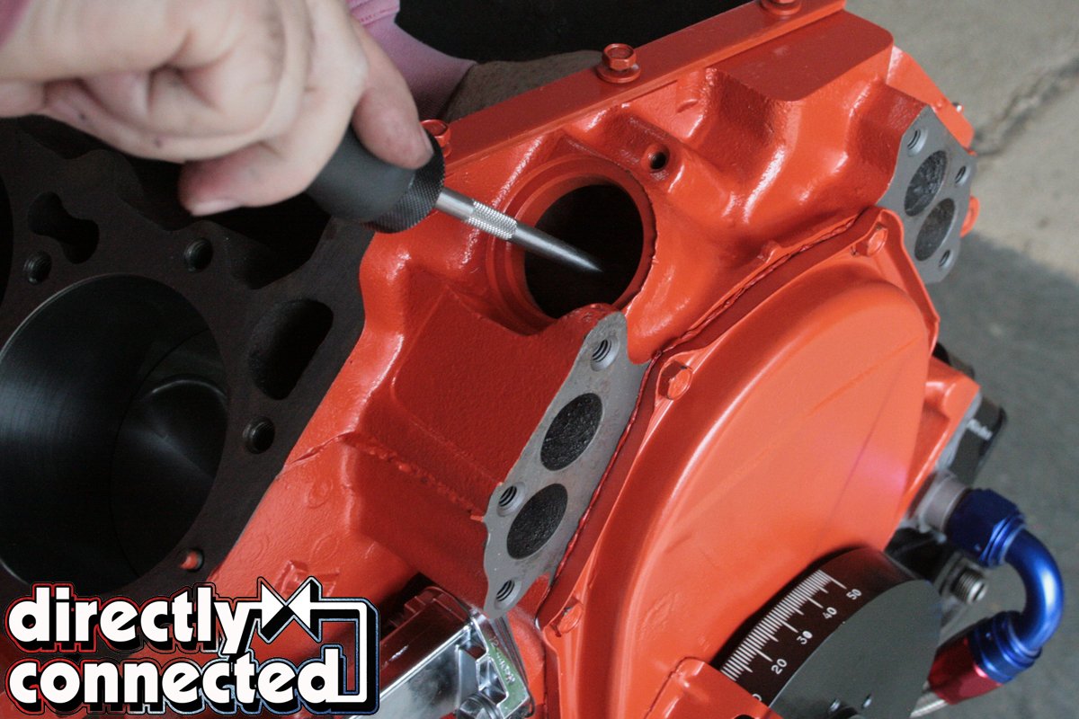 With all of our parts ready for assembly, we tapped in our brass freeze plugs and rear cam plug, and inserted the top half of our Clevite main bearings onto the journals, applying a generous amount of Red Line synthetic assembly lube, taking extra care to properly insert the rubberized rear main seal (coated in black silicone), with a slight offset to the machine surface.