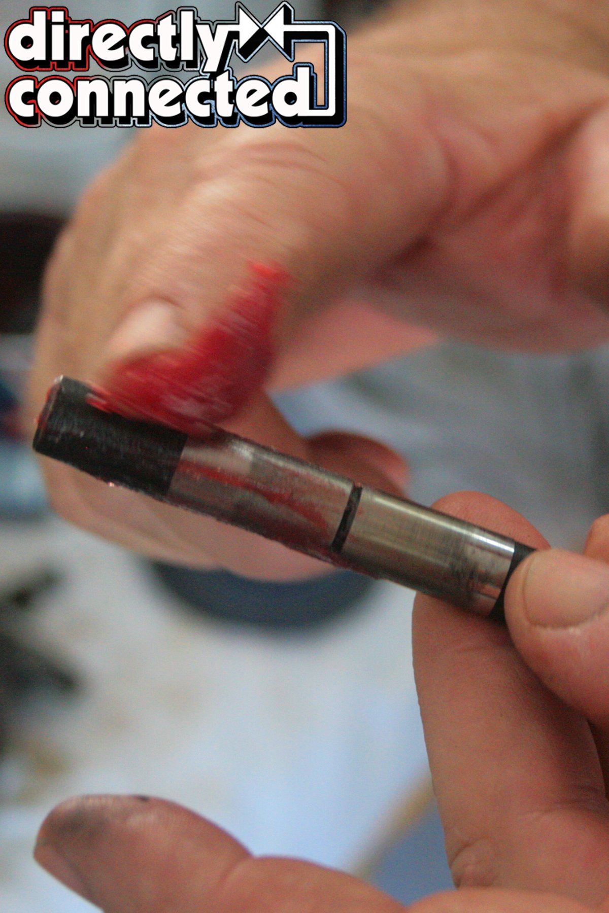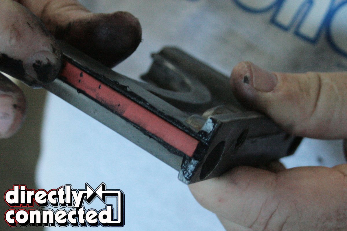 Applying more Red Line lube to the Clevite bearings, and using a ring compression tool and the wooden handle of our mallet, our pistons slid perfectly into place. A couple taps of our mallet, and each cap was in place (Shacklett had used a small diameter dremel to etch the right rod number to both the H-beam and its respective end cap). A dab of ARP moly to the threads and we torqued the rod bolts down to 75 ft.-lbs.