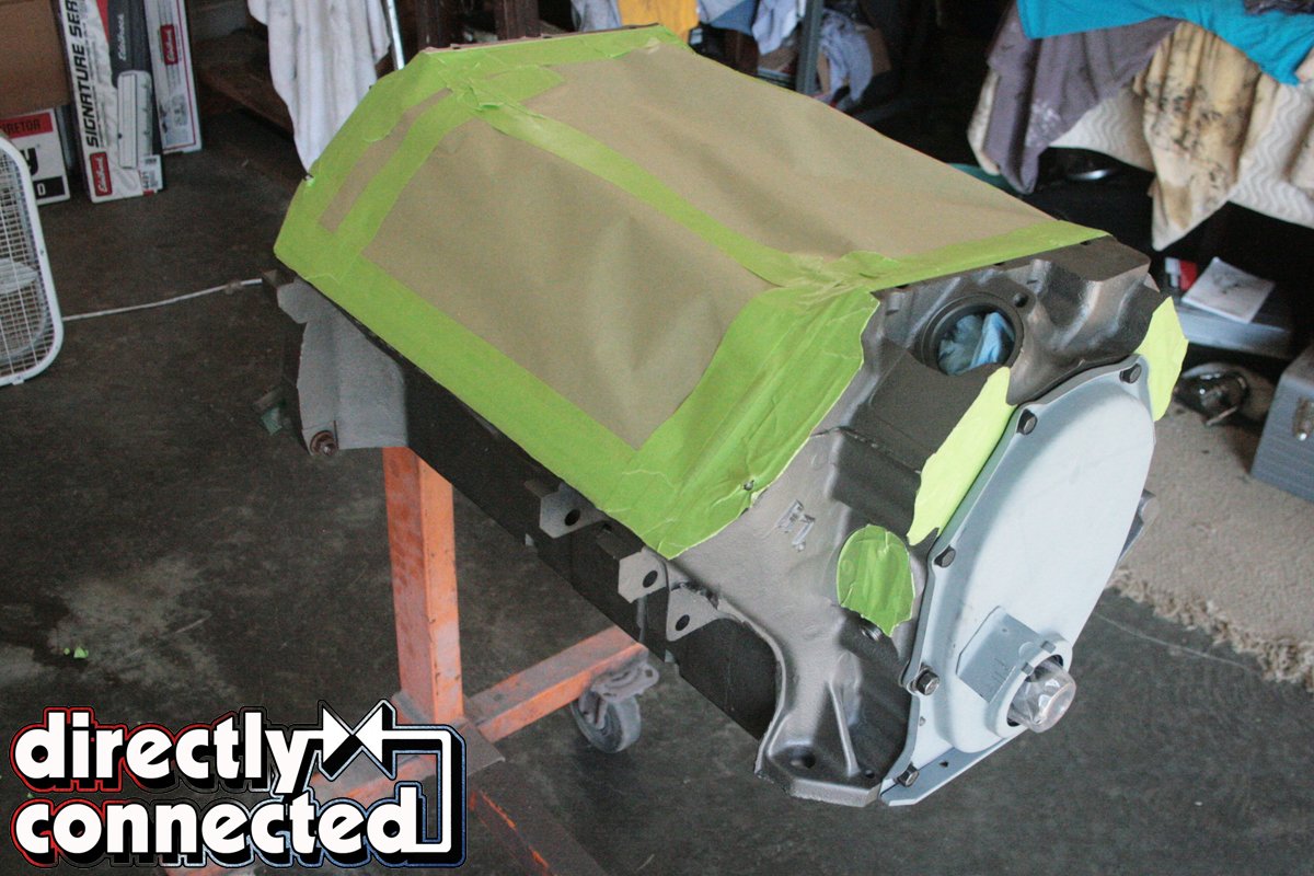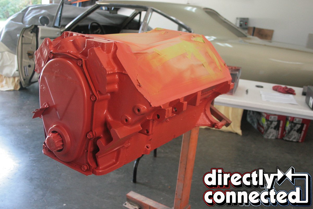 Next, before we could install anything else, we masked off the top of the block, careful to trim around the edges and applied a few coats of Mopar Performance Orange (not Hemi Orange, as the factory hue is a far more pale or yellowed orange than the deeper Mopar Performance Orange). It took a day to do it right, but the end result was very satisfying.