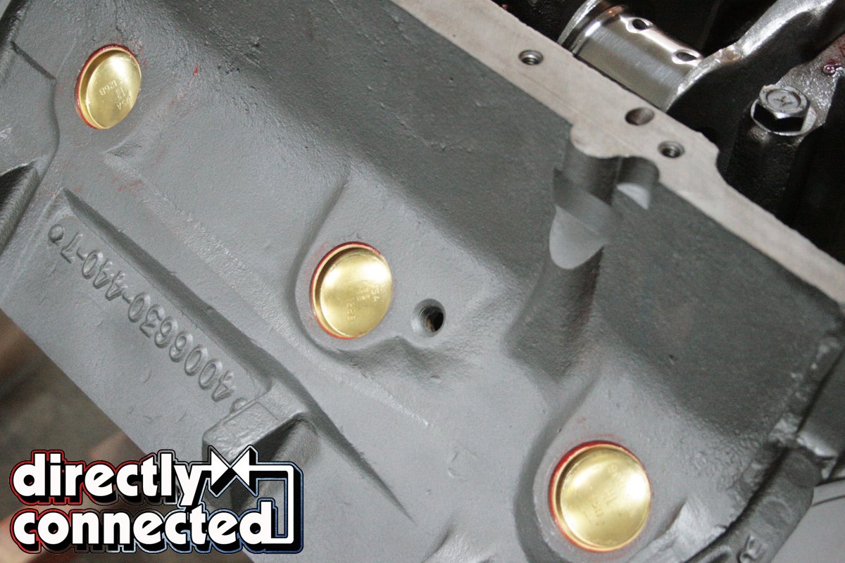 Above left: The Chrysler RB motor uses an aluminum end cap behind the #5 main journal that requires these rubber strips to properly seal the oil valley. Above right: The brass freeze plugs went in smoothly and we applied a thin bead of RTV to seal the plug.