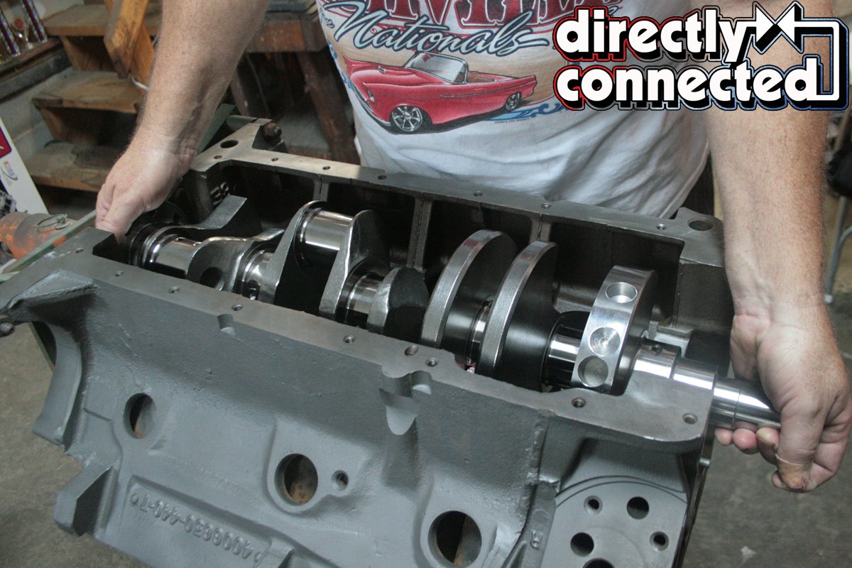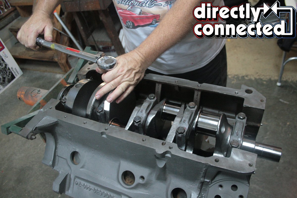 Above left: Using Red Line assembly lube, we coated our Clevite main bearings prior to installing the Eagle crank shown above center. Above right: After inserting and tapping the main journals flush with a rubber mallet, we torqued the factory Grade 8 bolts to the prerequisite specs.