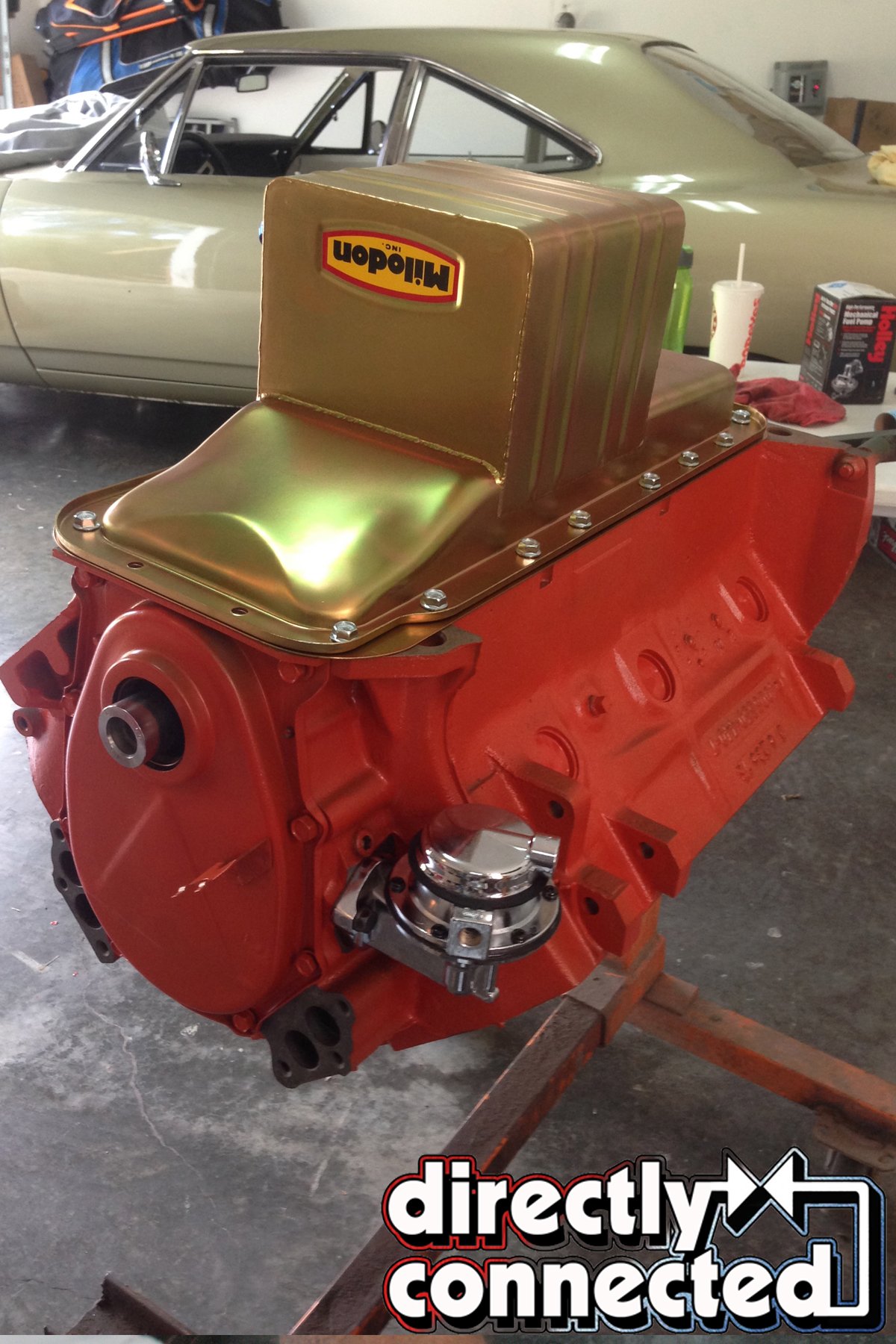 Above left: We masked off all mating surfaces and the cylinders. Above center: Several coats of Mopar Performance Orange helped to mask the raw iron block. Above right: Our newly painted 535ci Wedge is almost ready for final assembly.