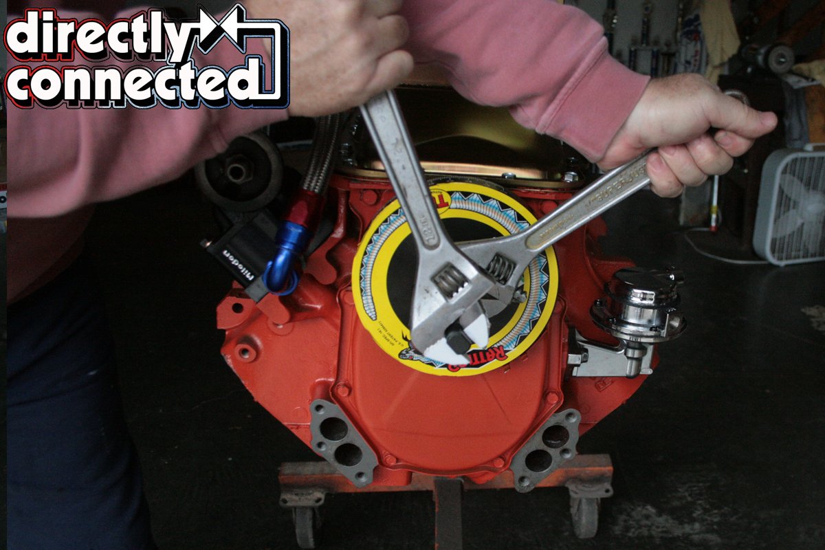 Above left: The TCI Auto Rattler dampener requires some serious motivation to index on the crank snout. We used a balancer puller kit in reverse to press it on. Above right: The final step was torquing down the ARP crank bolt to 135ft. lbs.