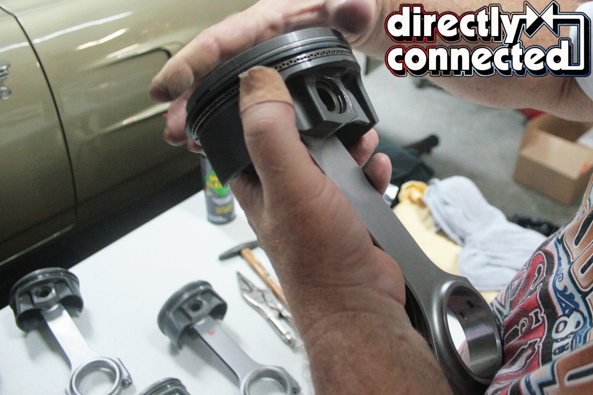 With the crank installed, we refocused on assembling our pistons and rods. The MAHLE pistons use a floating wrist pin held in with C-clip “locks.” These can be incredibly difficult to install or a real synch if you get the hang of them. Many choose to use a small screwdriver or dental tool to insert one end of the clip into the groove in the piston pin bore, then “walk” it into the groove until the outer end snaps in.